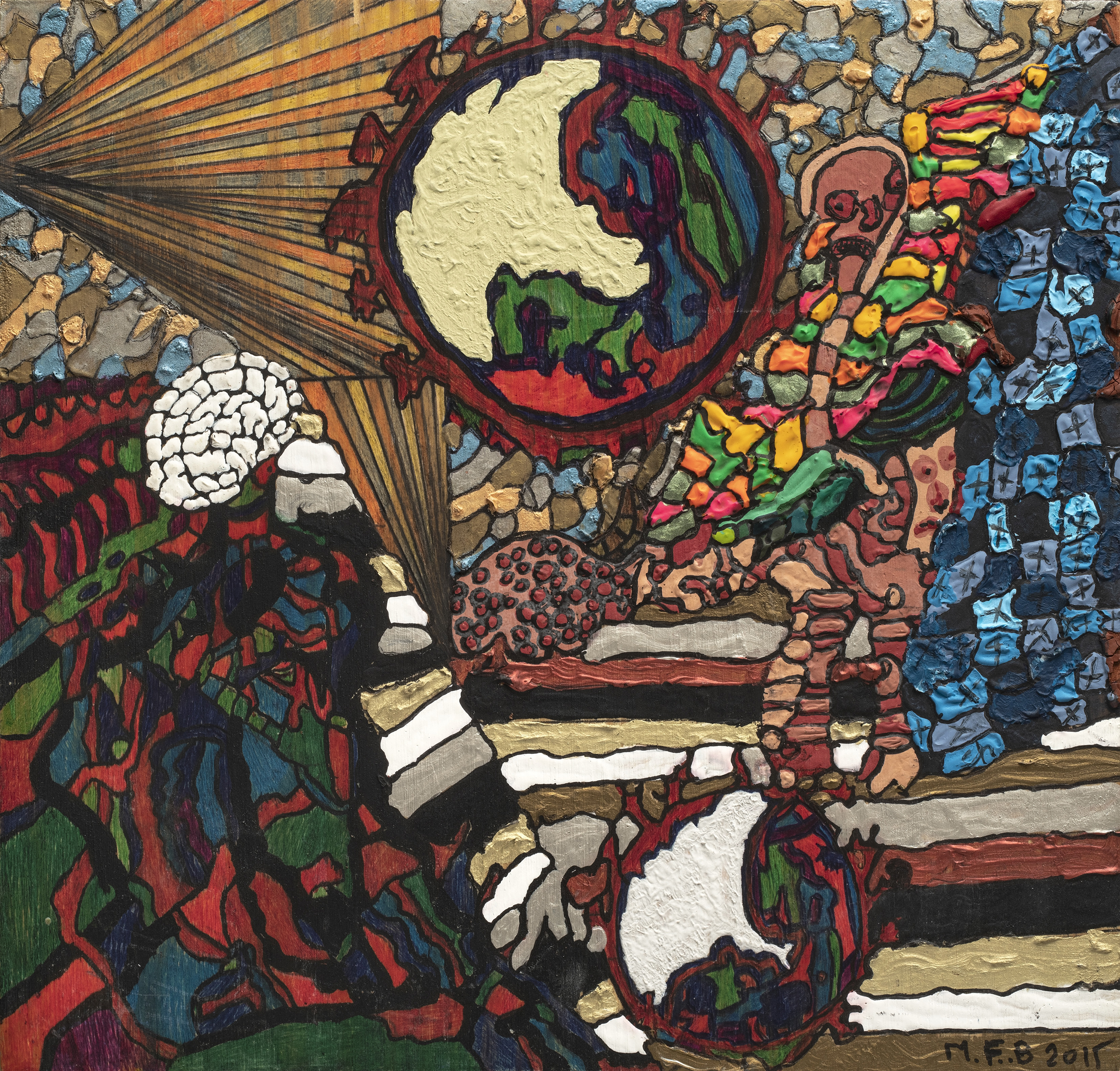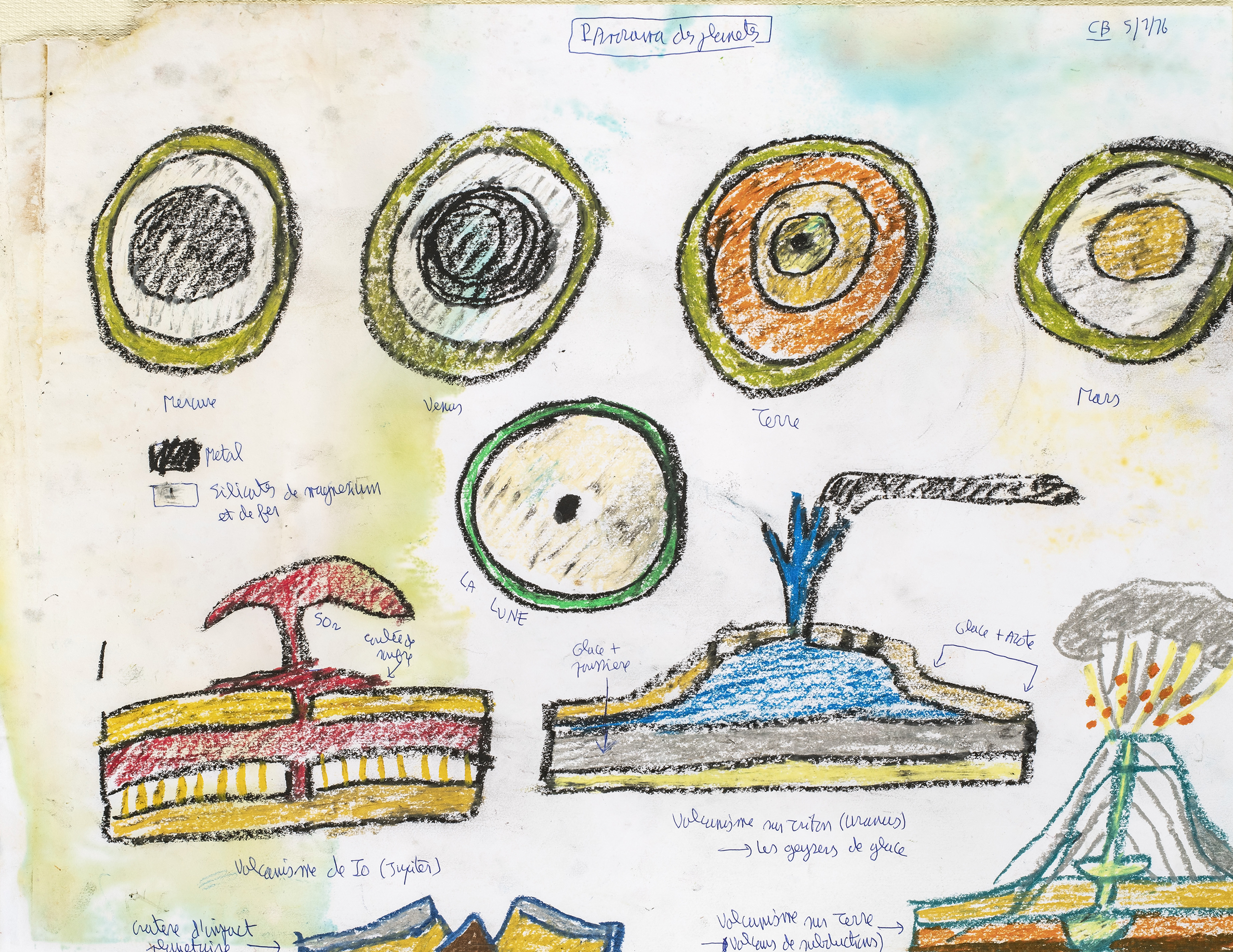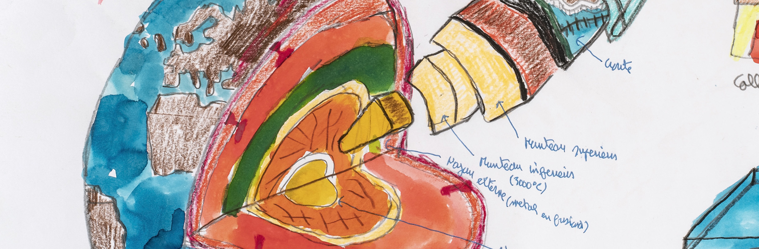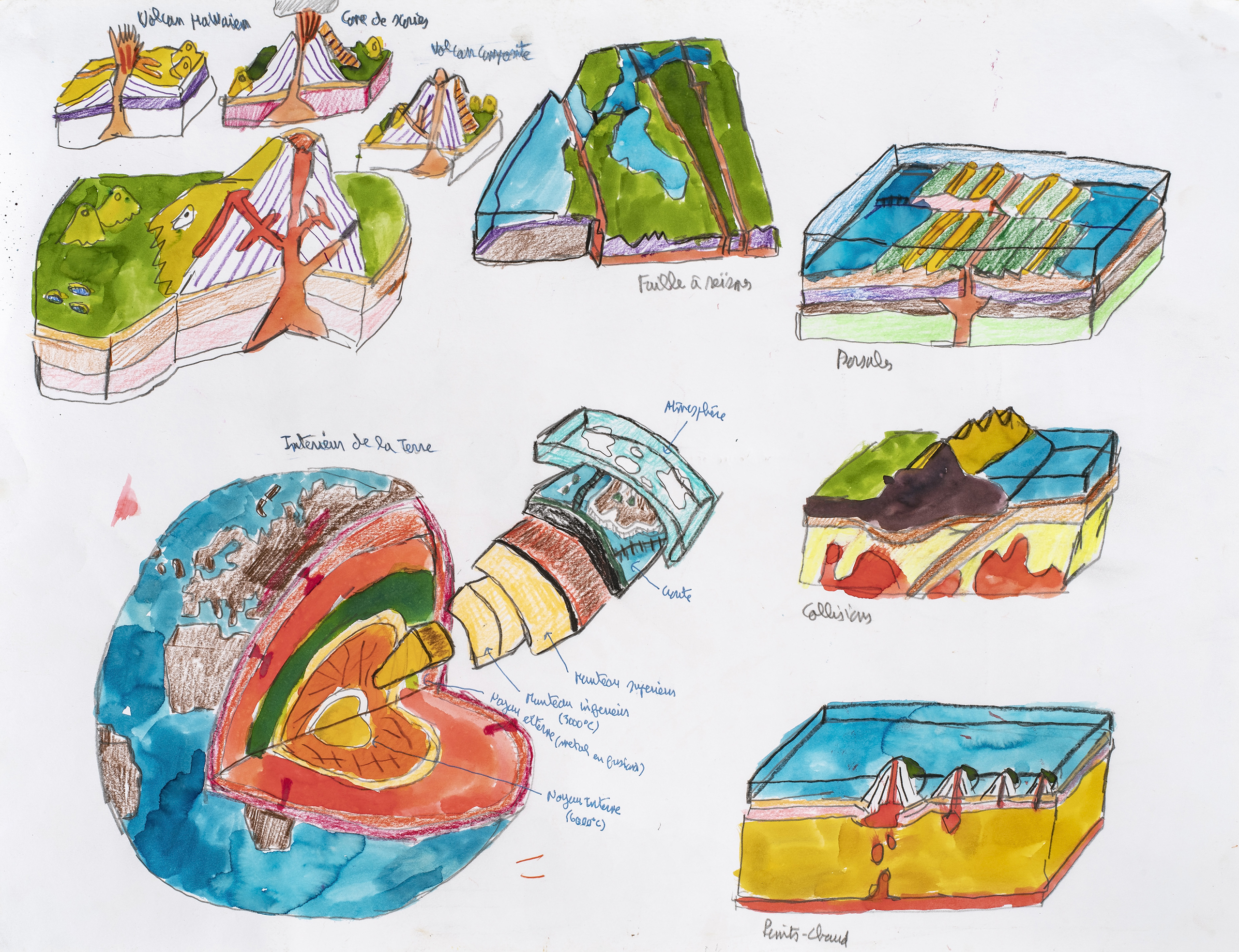 Les phénomènes éruptifs – jaillissement de lave, magma en ébullition ou chute de météorites… – deviennent vite son unique sujet. La couleur – au pastel ou à l’acrylique – joue un rôle central et se détourne de sa seule fonction informative pour émouvoir par sa puissance d’expression. Il rapporte de ses voyages – Islande ou États-Unis – des croquis de paysages, et de ses visites dans les musées des esquisses d’après des tableaux de maîtres, Léonard de Vinci ou Egon Schiele. Il consigne ses dessins dans des carnets à spirales. Peu à peu, la silhouette féminine fait son apparition dans son œuvre, discrètement, dans la partie haute ou basse du dessin d’une coupe géologique ou d’une caldera. Sans que l’on sache très bien si cette figure stéréotypée – jeune, blonde, nue aux formes généreuses – est partie prenante du motif. Tout comme les engins et autres objets du quotidien qui l’entourent, et dont Christophe aime à établir la nomenclature. Autodidacte, accompagné par l’atelier Personimages depuis plusieurs années, Christophe Baudouin est un des quatorze artistes lauréats EgArt 2020. Un ensemble d’œuvres a été montré dans l’exposition « Brut, génies insolites et artistes hors les normes » curatée par EgArt et le centre d’art Le Miroir, à Poitiers en 2023, dont plusieurs grands dessins acquis par le Fonds Art Sans Exclusion.