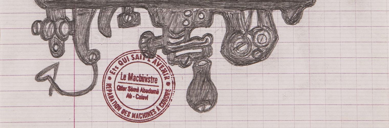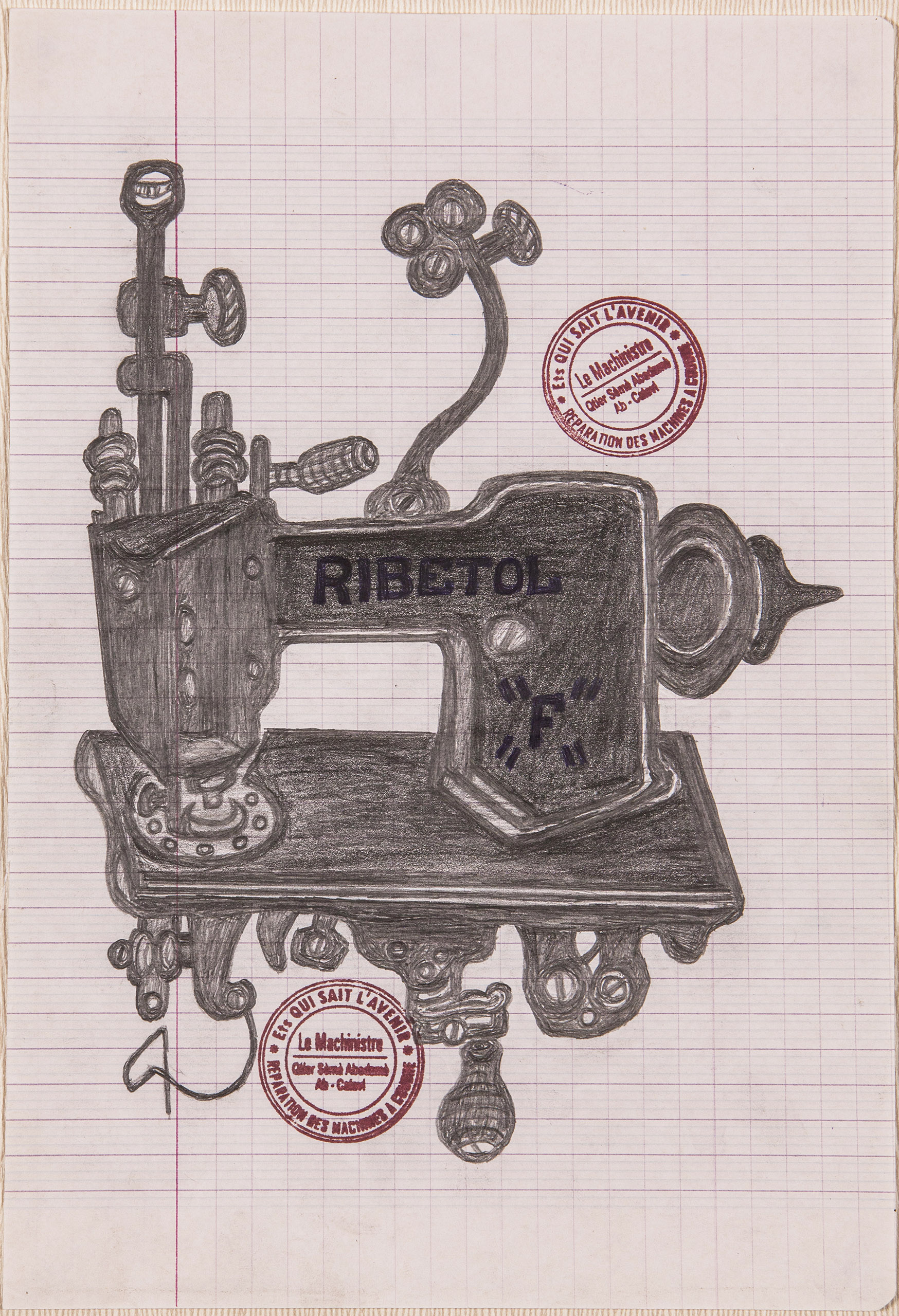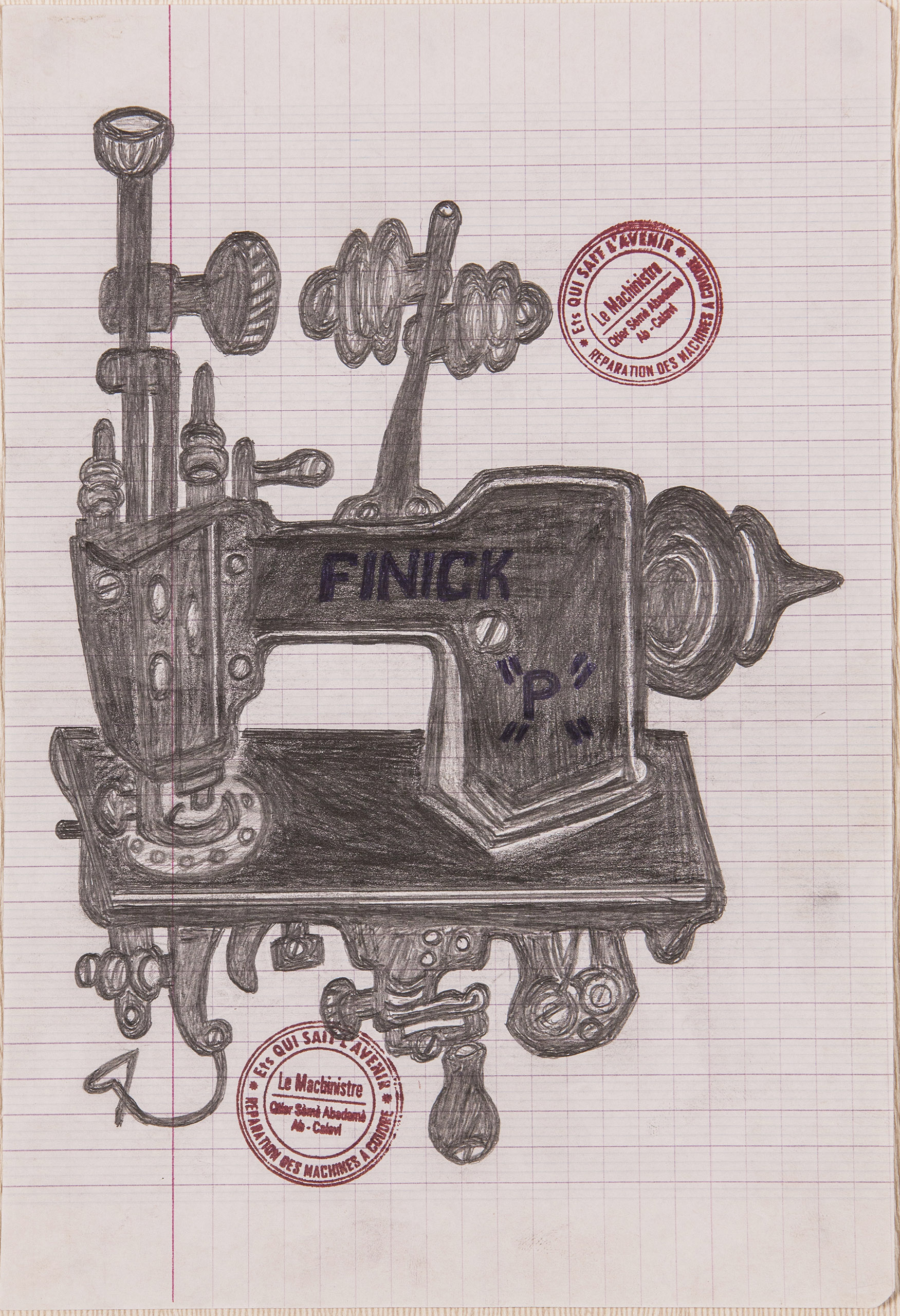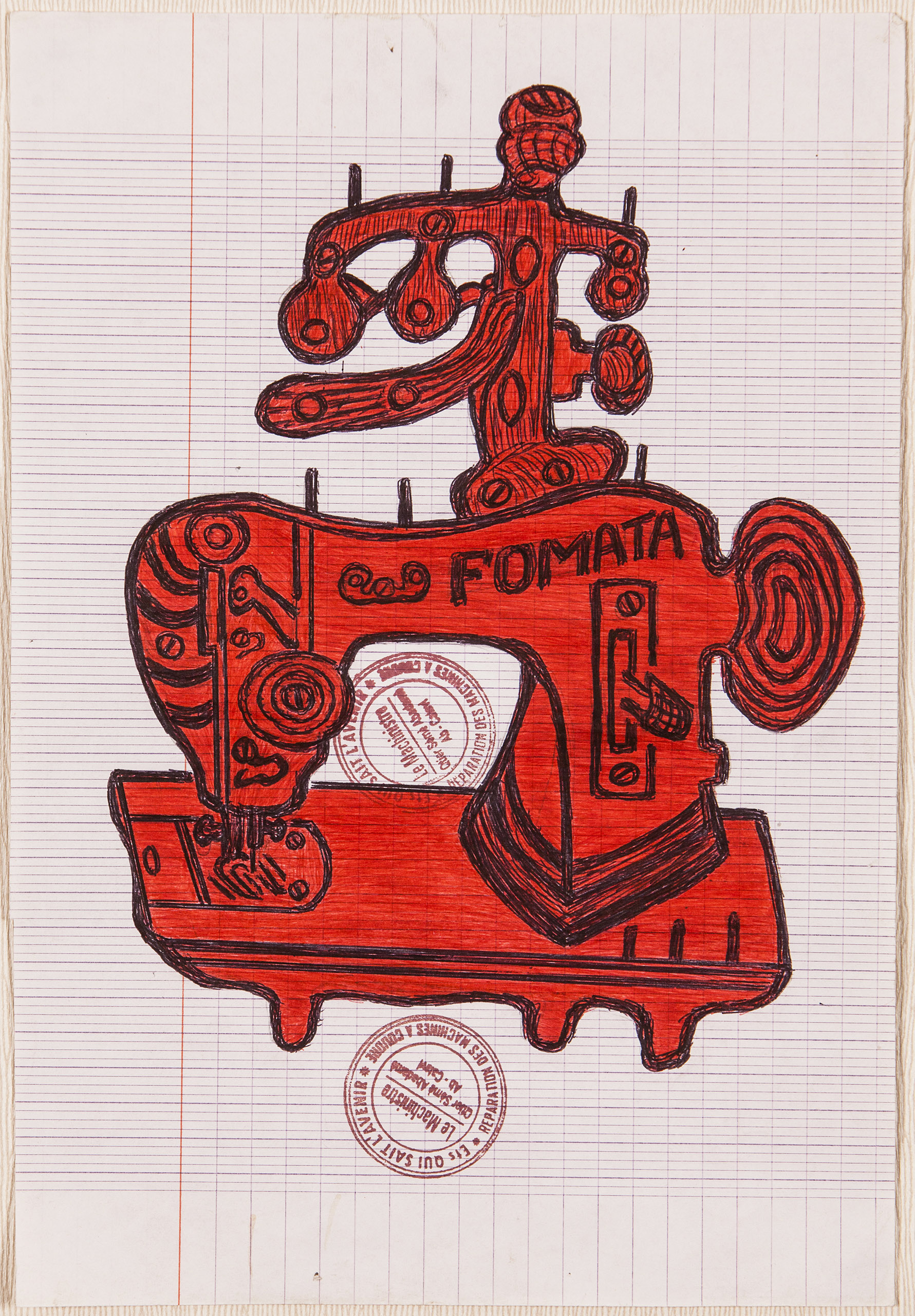 Ezékiel Messou naît en 1971 au Bénin. À l’âge de seize ans, il prend son autonomie vis à vis de sa famille et part s’installer au Nigéria. À Lagos, il se forme cinq années durant à la réparation des machines à coudre, avant de revenir au Bénin et d’ouvrir son atelier. C’est sur les murs de cet atelier qu’il se met à dessiner les machines qu’il doit réparer. Cet aide-mémoire lui permet de les remonter plus facilement. Au fil du temps, les murs se remplissent et le réparateur se met à dessiner sur des cahiers quadrillés d’écolier. Si la première intention est utilitaire, les dessins qu’il compile à l’abri des regards dépassent vite leur fonction pratique. Collection dessinée, ils sont une trace de tous les modèles passés entre les mains du mécanicien passionné. Plus proche de la création artistique que du dessin technique. En 2013, Lucienne Peiry, émissaire de la Collection de l’Art Brut de Lausanne, le rencontre par l’intermédiaire de Léo Ramseyer. L’étudiant suisse en histoire de l’art avait fait sa connaissance dix ans plus tôt (au cours de la rédaction d’un mémoire sur les enseignes publicitaires au Bénin). Ezékiel Messou refuse de mettre un prix sur ses dessins, mais accepte d’échanger plusieurs carnets contre un scooter dont il a besoin. La Collection de l’Art Brut acquiert trois de ses carnets dans lesquels plus de 130 machines à coudre sont représentées. Les dessins plus récents, souvent réalisés au stylo bille de couleurs sur grand format, ont une dimension de plus en plus ornementale. Les silhouettes de machines stylisées sont recouvertes de motifs géométriques. Ezékiel Messou dessine aussi des maisons sur pilotis, semblables à celle qu’il habite. Le père de dix enfants vit avec ses deux femmes à Ganvié, la « Venise africaine », non loin de son atelier qu’il rejoint en pirogue chaque matin. Présentes à Lausanne, les œuvres d’Ézékiel Messou sont également conservées au Musée d’art moderne, d’art contemporain et d’art brut Lille-Metropole, et dans la collection Treger-Saint Silvestre au Portugal. En 2021, la galerie Françoise Livinec montre son travail dans une exposition collective.
