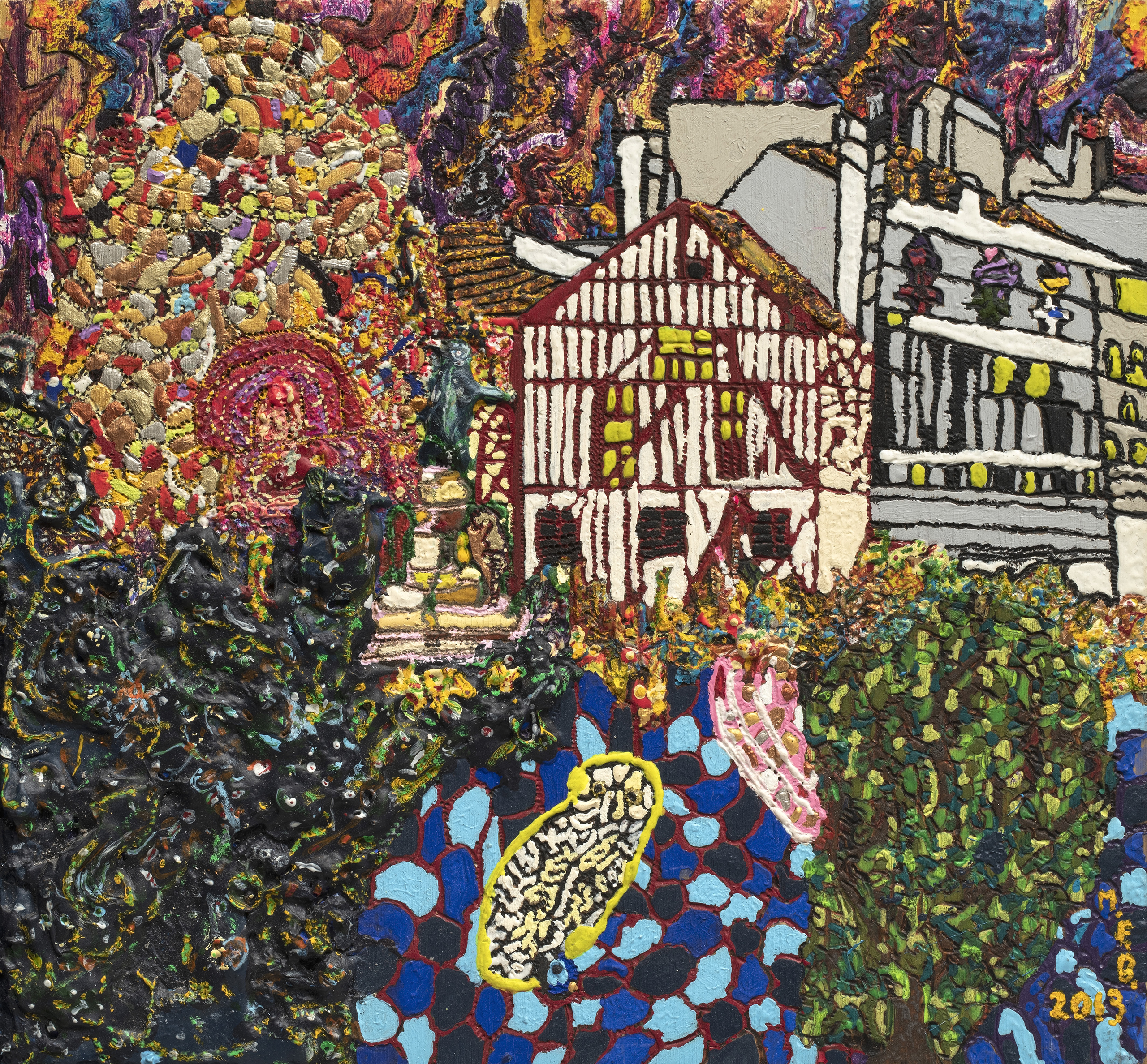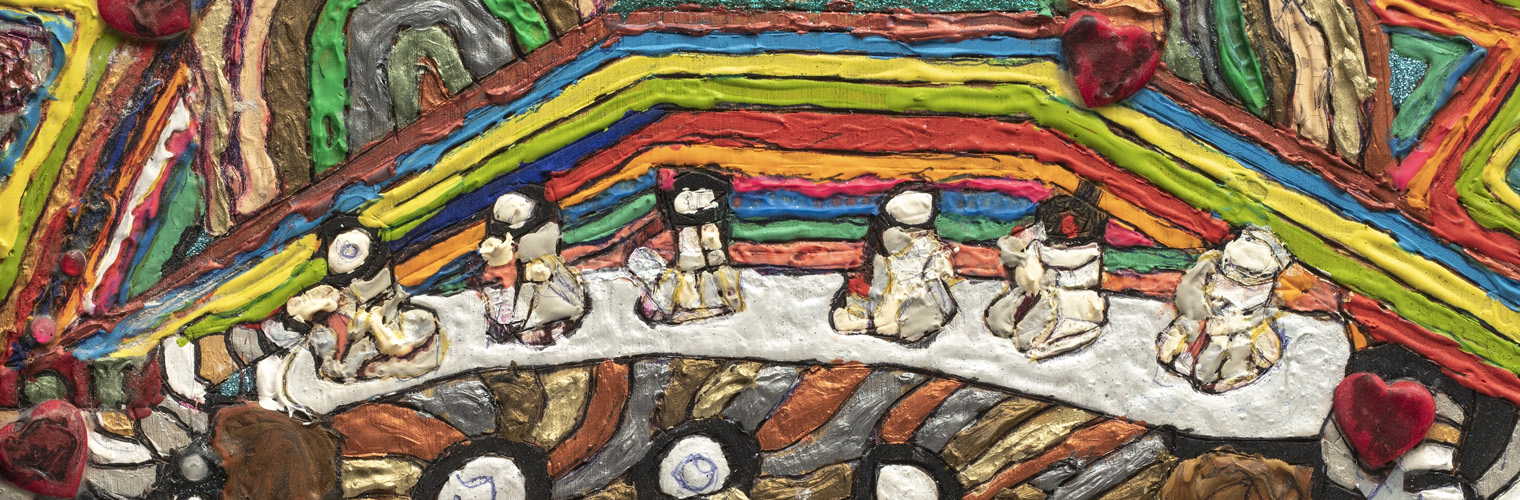 Né à Vesoul (70), Marc-François Bresson vit en Bourgogne. Au lycée technique, il apprend à se servir d’un tour et d’un étau-limeur pour travailler le métal. En 1968, après un an en lycée général, il entre en Centre d’aide par le travail. Il donne parfois un coup de main à son père dans la boutique familiale d’articles de sport. A 19 ans, il réalise ses premiers dessins en milieu hospitalier, sur proposition d’un animateur qui lui propose du papier et des encres. Il rencontre à cette occasion un ancien peintre de Montmartre, qui lui fait don d’une boite de peinture à l’huile en lui souhaitant « bonne chance ! ». A 26 ans, il rencontre celle qui deviendra sa femme. Il crée aujourd’hui chez lui, dans une petite pièce à part où se concentre son univers, sous forme d’affiches, poèmes découpés, cartes postales griffonnées, articles de presse, fixés au mur et objets de toutes sortes. Il travaille surtout sur panneaux de bois et mêle à l’acrylique du sable coloré et même des cendres. Dans ses créations se succèdent et se racontent les moments importants de sa vie, sa passion pour les grands footballeurs, les groupes de british blues des années 70, et un peintre admiré comme Toulouse-Lautrec. Et aussi les lieux visités ou rêvés comme le lac sacré Namtso au Tibet, des épisodes bibliques ou les « visions » qui l’ont marqué. Chacun de ses tableaux est annoté au dos et au stylo d’une succession de mots qui évoquent pêle-mêle l’amour, la famille, les lieux aimés… comme un pense-bête de vie. Marc-François Bresson est lauréat EgArt 2020. Cinq œuvres sur bois et papier ont été acquises par le Fonds Art Sans Exclusion.