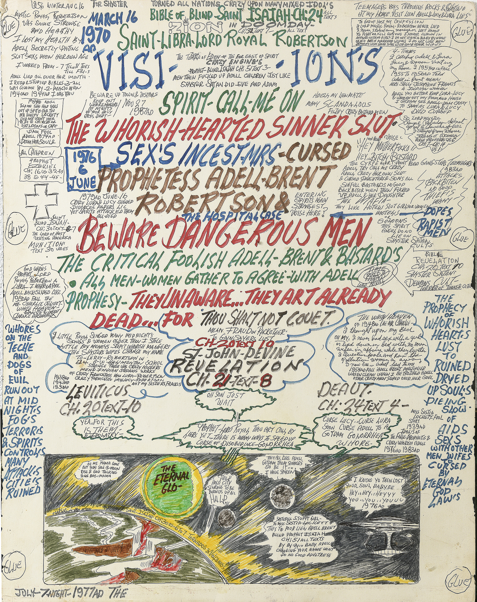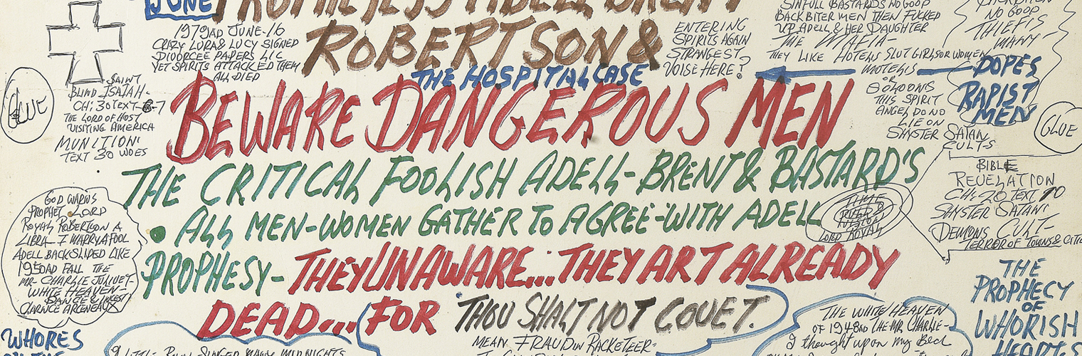 Quand son épouse le quitte définitivement, Robertson développe une haine féroce envers les femmes. Il se fait appeler « Prophet » Royal Robertson et commence à décrire des scènes où Dieu pilote des vaisseaux spatiaux…Il s’engage alors dans une intense activité créatrice.